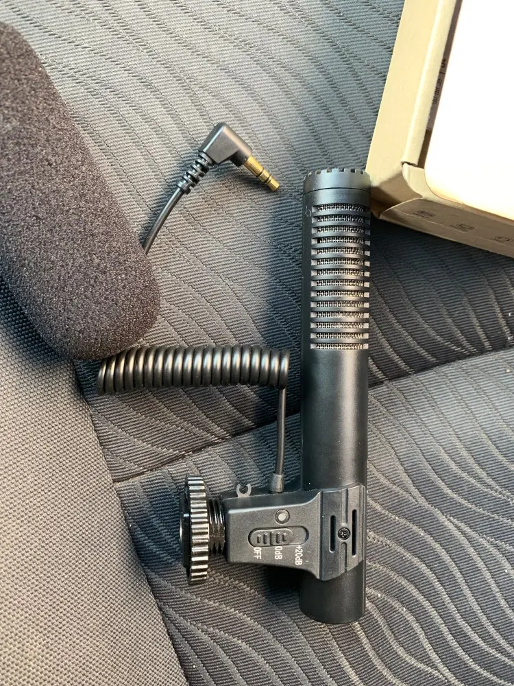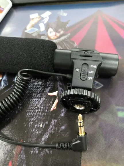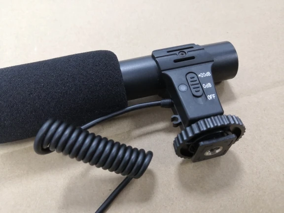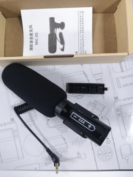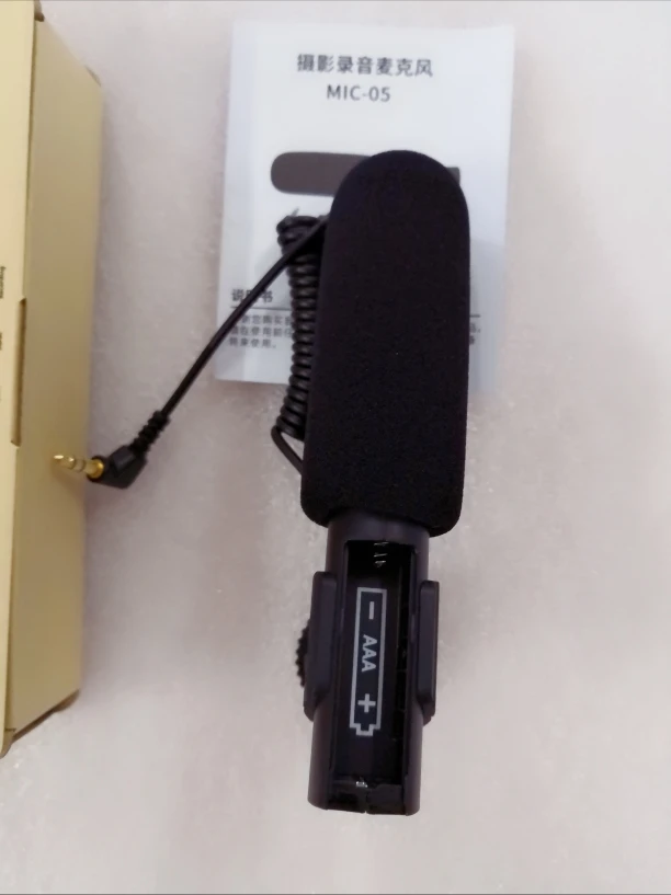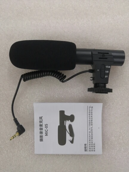 Simple and light microphone. Just put in a AAA battery, then plug the 3.5mm plug into the camera MIC jack to use it.